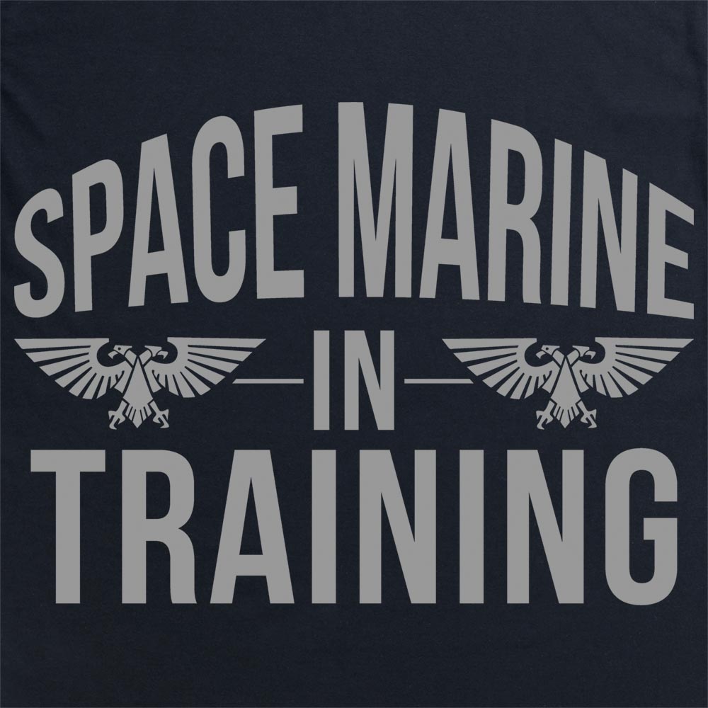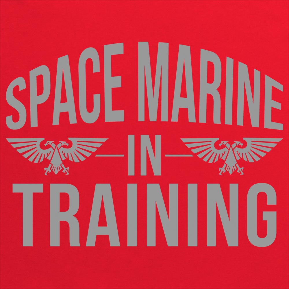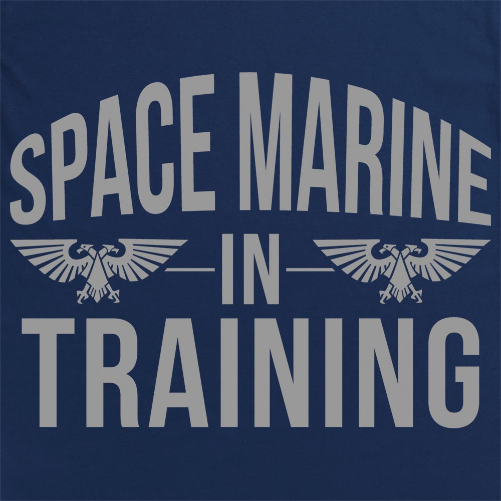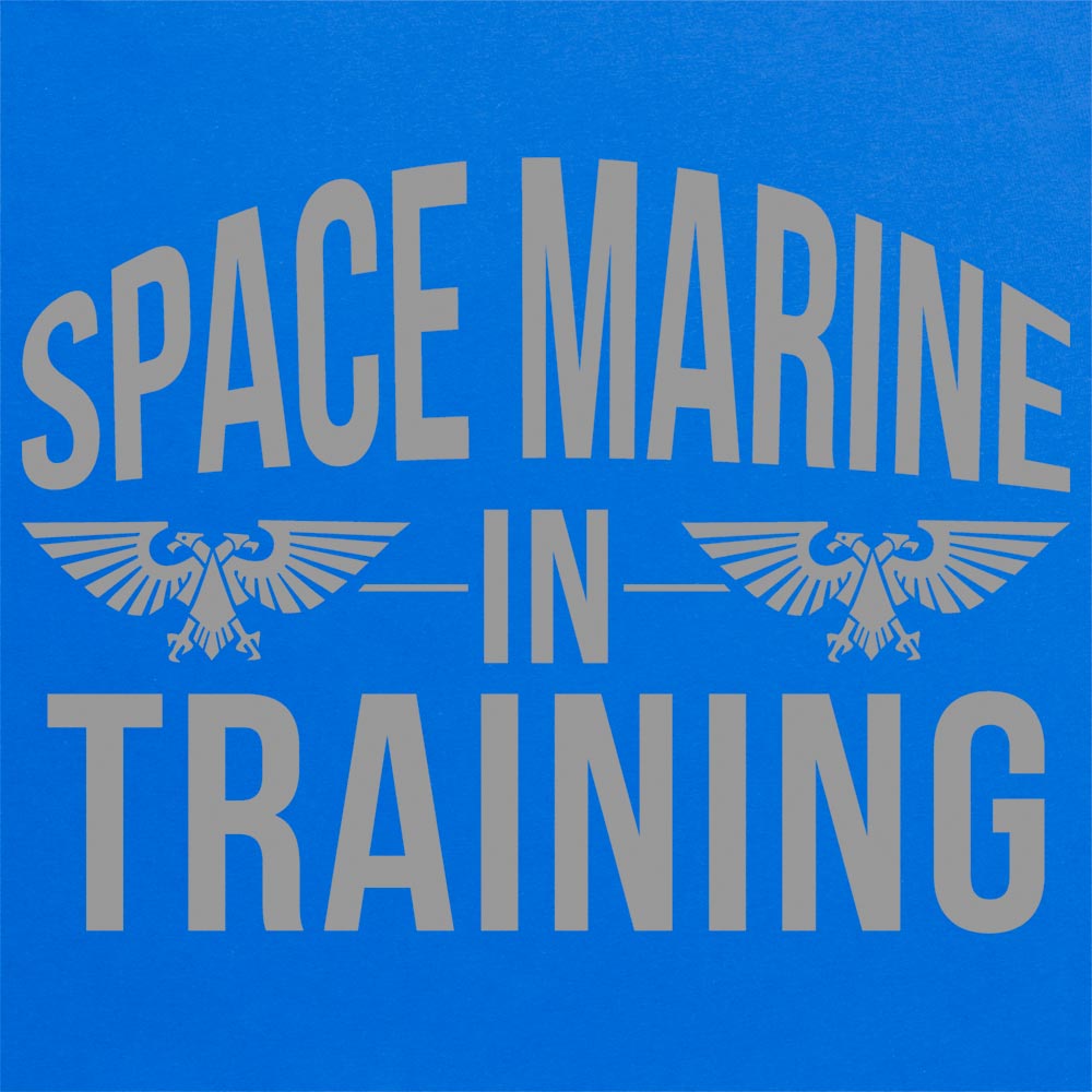 Official Space Marine In Training Kids T Shirt available in sizes XS-XL on Black, Navy, Red, and Royal Blue.